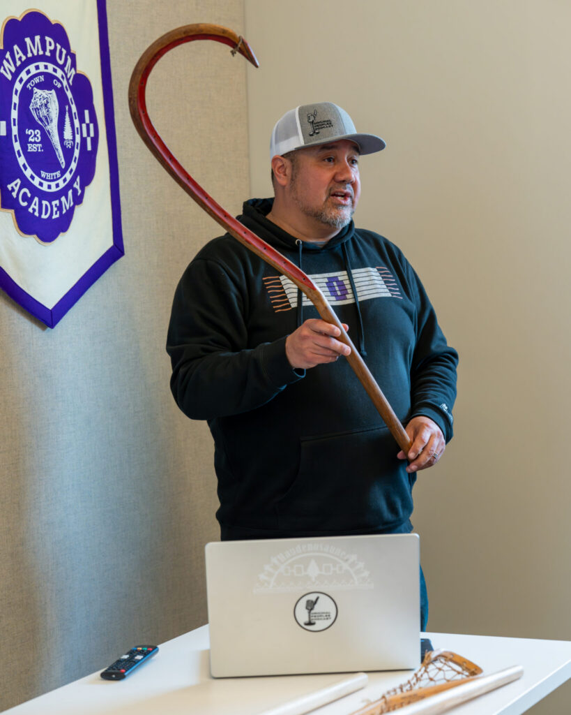 Players and staff also had the opportunity to handle wooden lacrosse sticks, including one from the 1800s that belonged to William Hoag, the 12th president of the Seneca Nation. Jemison discussed how lacrosse has historically been used to resolve disputes and promote healing, often referred to as the Medicine Game. In Haudenosaunee culture, lacrosse sticks are symbolic throughout a person’s life — from cradle to grave — representing the deep connection between the game, the wood, and the natural world.