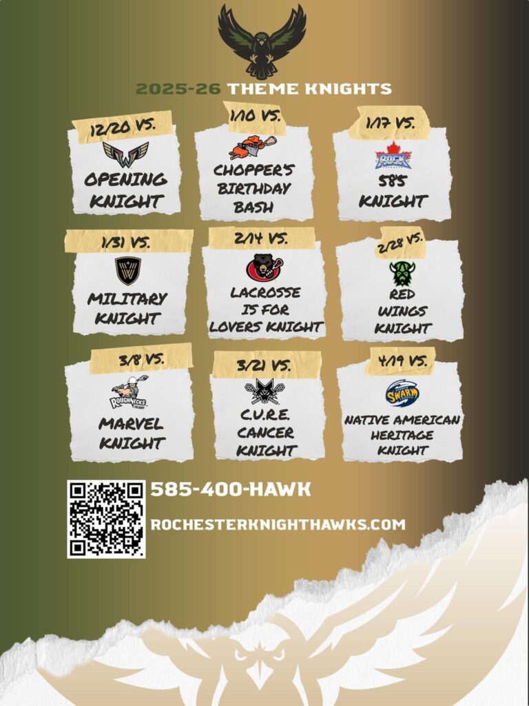 The Rochester Knighthawks announced their promotional schedule for the 2025-26 season. Stay tuned as we update more information for each specific theme night.